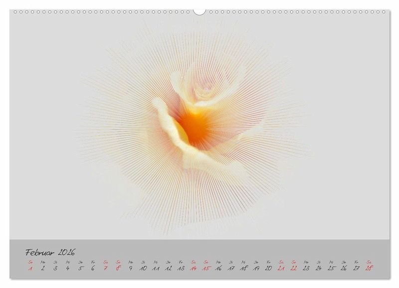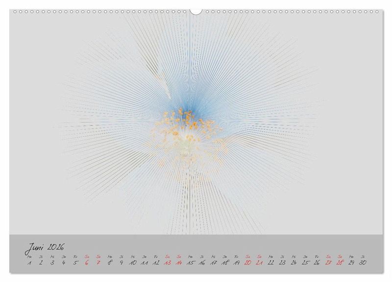 In meinem Kalender "verstecken" sich Blüten hinter angedeuteten Sonnenstrahlen. Diese Sonnenstrahlen setzen das Herz der Blüten frei und vielleicht öffnet sich auch das Herz seines Betrachters. Genießen sie die Momente von Sommer, Sonne und Blütenzauber.