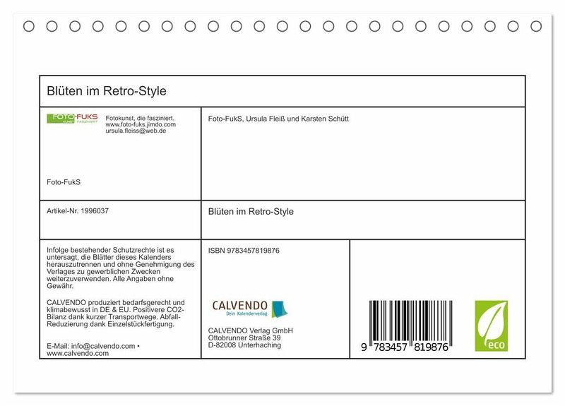 QUALITÄT - Hochwertiger Fotokalender mit 12 wunderschönen Motiven auf lichtbeständigem Bilderdruckpapier, robuste Spiralbindung.NACHHALTIG - deutliche Abfallreduzierung durch bedarfsgerechte Einzelstückfertigung, umweltfreundliches FSC-zertifiziertes Papier, Produktion in Deutschland, klimabewusste Logistik.PERFEKTES GESCHENK - Kalender für Freunde und Familie, für Kinder und Erwachsene, jung und alt, zu Weihnachten, Geburtstag oder zwischendurch.VIELFALT - Bildkalender in verschiedenen Formaten, z.B. DIN A5, DIN A4, DIN A3 sowie DIN A2. Ob Naturmotiv, Gemälde oder Fotos, ideal für ein persönliches Wohlfühlambiente.Einzigartige Fotografien von Blüten im Retro- und Vintage-Style interpretiert von Autor(in): Foto-FukS