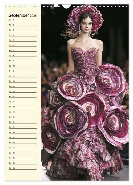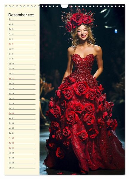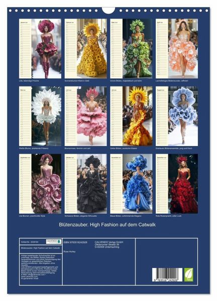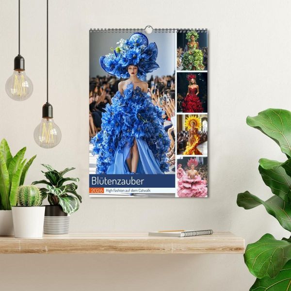 Dieser exklusive Kalender präsentiert High Fashion in einer einzigartigen Verbindung von floraler Kunst und Mode. Jedes Model auf dem Catwalk trägt ein liebevoll gestaltetes Kleid, inspiriert von wunderschönen Blumen. Die farbenprächtigen Designs, von Sonnenblumen über Rosen bis hin zu Lilien, setzen den glamourösen Charakter jedes Outfits perfekt in Szene. Jede Illustration wurde mit Hilfe von KI erstellt, um die extravagante Schönheit der Blütenkleider zu betonen.
