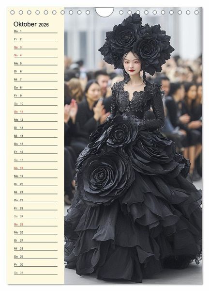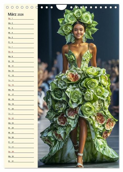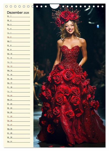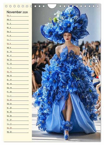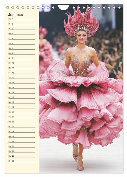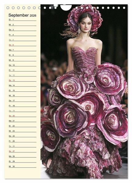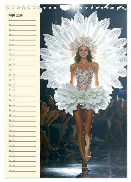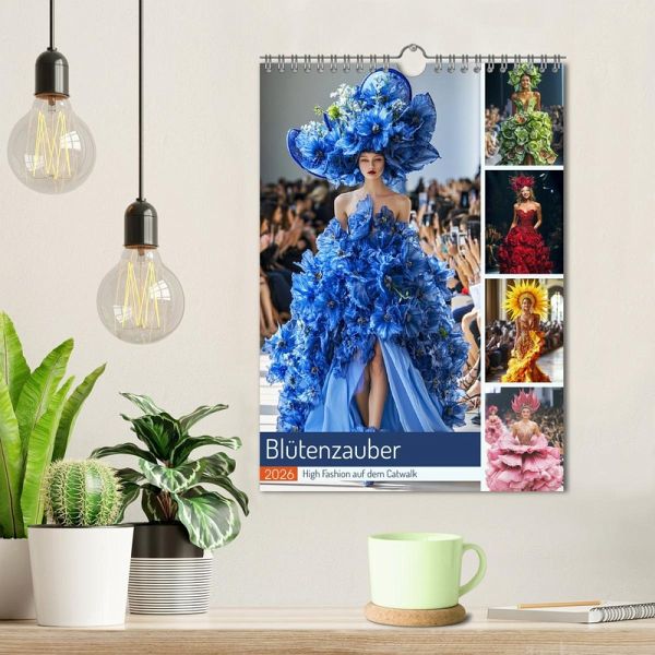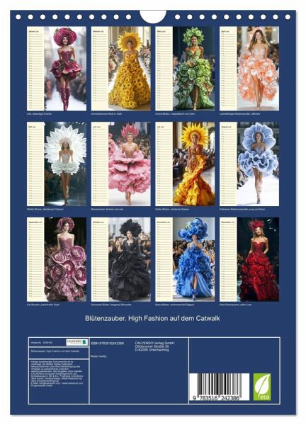 Dieser exklusive Kalender präsentiert High Fashion in einer einzigartigen Verbindung von floraler Kunst und Mode. Jedes Model auf dem Catwalk trägt ein liebevoll gestaltetes Kleid, inspiriert von wunderschönen Blumen. Die farbenprächtigen Designs, von Sonnenblumen über Rosen bis hin zu Lilien, setzen den glamourösen Charakter jedes Outfits perfekt in Szene. Jede Illustration wurde mit Hilfe von KI erstellt, um die extravagante Schönheit der Blütenkleider zu betonen.