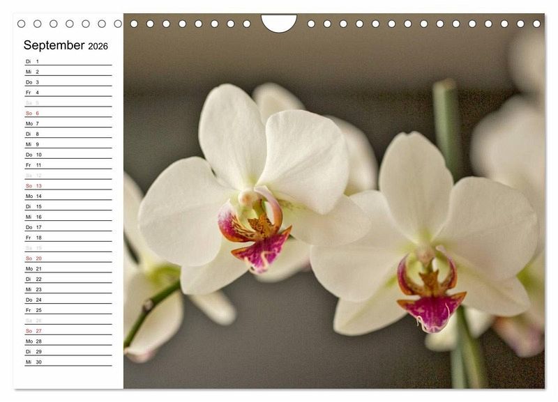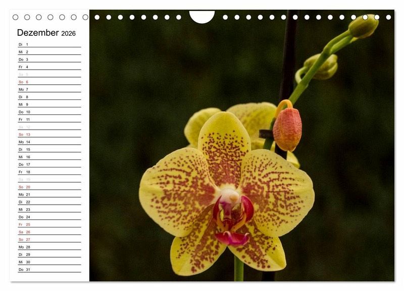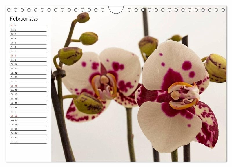 In der Familie der Orchideen gibt es Blüten in den unterschiedlichsten Formen und Farben. Die traumhafte Eleganz und einnehmende Schönheit dieser Pflanzen wird in zauberhaften Nahaufnahmen wiedergegeben. Ein farbenfroher Blütenzauber der besonders Art begleitet Sie durchs Jahr.