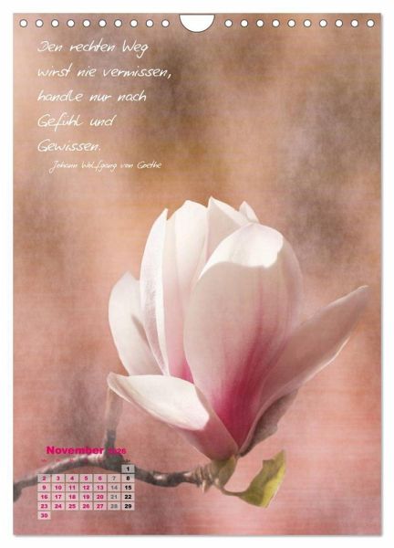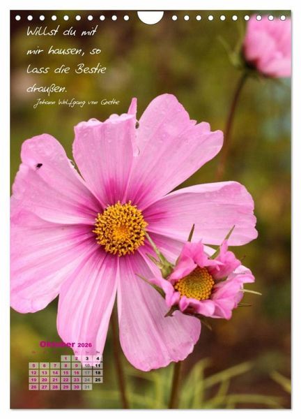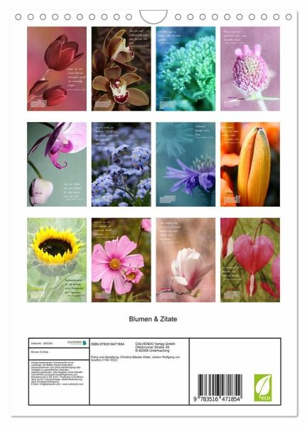 QUALITÄT - Hochwertiger Fotokalender mit 12 wunderschönen Motiven auf lichtbeständigem Bilderdruckpapier, robuste Spiralbindung mit Aufhängebügel.NACHHALTIG - deutliche Abfallreduzierung durch bedarfsgerechte Einzelstückfertigung, umweltfreundliches FSC-zertifiziertes Papier, Produktion in Deutschland, klimabewusste Logistik.PERFEKTES GESCHENK - Kalender für Freunde und Familie, für Kinder und Erwachsene, jung und alt, zu Weihnachten, Geburtstag oder zwischendurch.VIELFALT - Bildkalender in verschiedenen Formaten, z.B. DIN A5, DIN A4, DIN A3 sowie DIN A2. Ob Naturmotiv, Gemälde oder Fotos, ideal für ein persönliches Wohlfühlambiente.Blumenfotografien mit Zitaten von Johann Wolfgang von Goethe von Autor(in): Christine Bässler