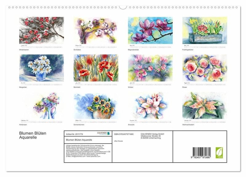 PREMIUM-LINIE - Brillanter Fotokalender mit 12 wunderschönen Motiven, Kunstdruck in Hochglanz in Museumsqualität.QUALITÄT - edle Materialien, stabile Rückwand mit 2 innovativen Einstecktaschen für eine optimale Präsentation an der Wand.NACHHALTIG - deutliche Abfallreduzierung durch bedarfsgerechte Einzelstückfertigung, umweltfreundliches FSC-zertifiziertes Papier, Produktion in Deutschland, klimabewusste Logistik.PERFEKTES GESCHENK - Kalender für Freunde und Familie, für Kinder und Erwachsene, jung und alt, zu Weihnachten, Geburtstagoder zwischendurch.Handgemalte Blumenaquarelle von Autor(in): Jitka Krause