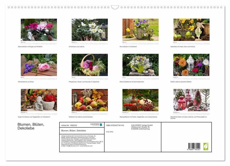 QUALITÄT - Hochwertiger Fotokalender mit 12 wunderschönen Motiven auf lichtbeständigem Bilderdruckpapier, robuste Spiralbindung mit Aufhängebügel.NACHHALTIG - deutliche Abfallreduzierung durch bedarfsgerechte Einzelstückfertigung, umweltfreundliches FSC-zertifiziertes Papier, Produktion in Deutschland, klimabewusste Logistik.PERFEKTES GESCHENK - Kalender für Freunde und Familie, für Kinder und Erwachsene, jung und alt, zu Weihnachten, Geburtstag oder zwischendurch.VIELFALT - Bildkalender in verschiedenen Formaten, z.B. DIN A5, DIN A4, DIN A3 sowie DIN A2. Ob Naturmotiv, Gemälde oder Fotos, ideal für ein persönliches Wohlfühlambiente.Florale Dekorationen passend zu den Jahreszeiten von Autor(in): Anita Witte