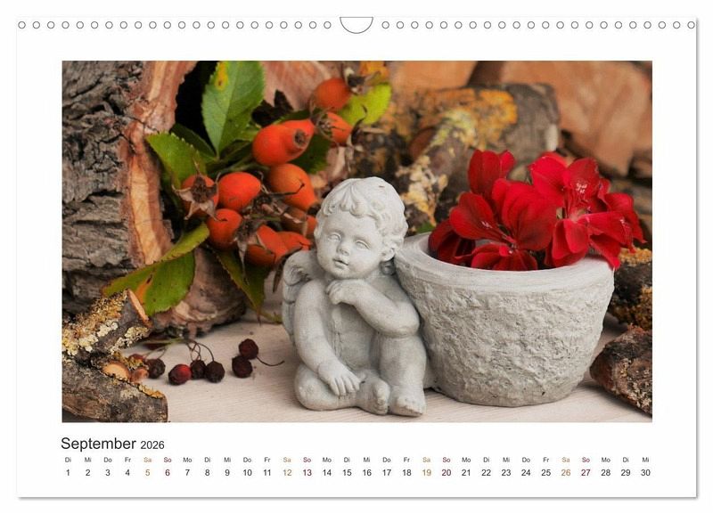 September: Engel mit Geranie und Hagebutten vor Holzstamm