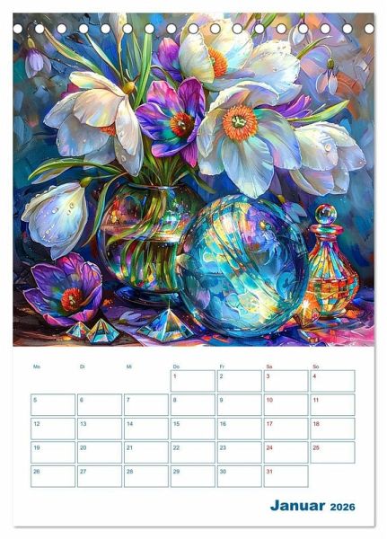 Mit dem floralen Jahresplaner hast du deine Termine immer im Blick und zugleich jeden Monat ein wundervolles Motiv der schönsten Blumen und Arrangements. Jedes Bild wurde mit Hilfe einer KI erstellt und ist voller Glanz und Farbenfreude.
