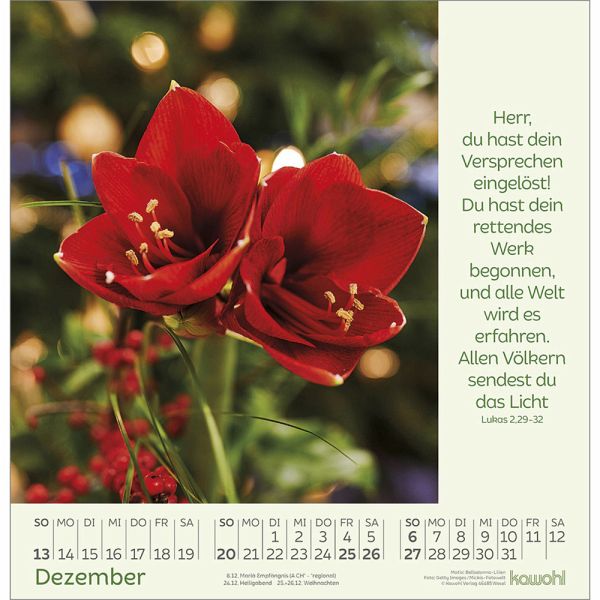 Blumen, die nicht verblühenWunderschöne, strahlende Bilder machen diesen aparten Kalender zu einem nicht verblühenden Blumengruß. Wegweisende, Mut machende Bibelworte verstärken die Bildwirkung und geben diesem Kalender seine unverwechselbare, leuchtende Ausstrahlung.Wand-Kalender:- mit Bibelworten und Blumenbildern- Kunstdruck-Papier