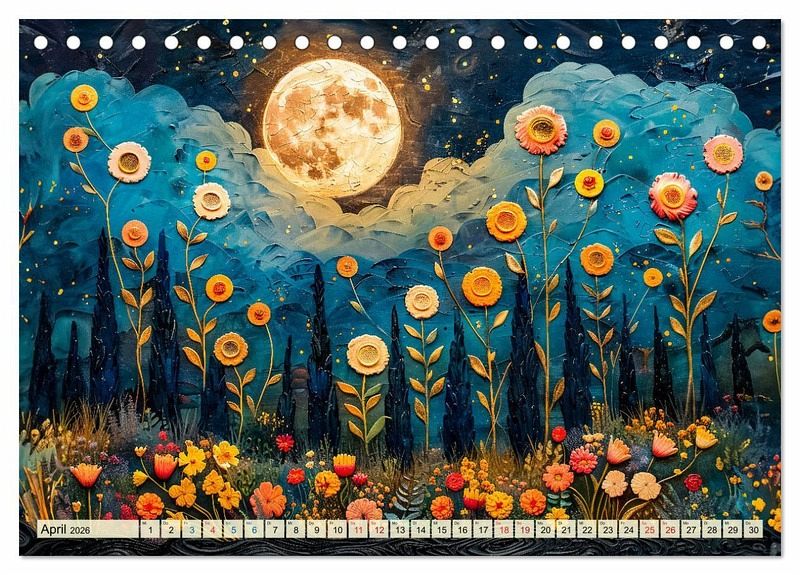 Tauchen Sie ein in eine Welt voller Magie und Romantik mit unserem einzigartigen Kalender "Blumennächte im Mondlicht - Poesie des Himmels und der Erde". Dieser wunderschöne KI-generierte Kalender bringt Ihnen die atemberaubende Schönheit von Blumenlandschaften, die im sanften Schein des Mondlichts erstrahlen, direkt nach Hause.