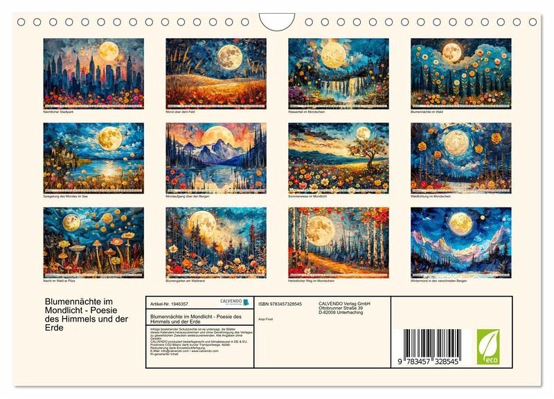 QUALITÄT - Hochwertiger Fotokalender mit 12 wunderschönen Motiven auf lichtbeständigem Bilderdruckpapier, robuste Spiralbindung mit Aufhängebügel.NACHHALTIG - deutliche Abfallreduzierung durch bedarfsgerechte Einzelstückfertigung, umweltfreundliches FSC-zertifiziertes Papier, Produktion in Deutschland, klimabewusste Logistik.PERFEKTES GESCHENK - Kalender für Freunde und Familie, für Kinder und Erwachsene, jung und alt, zu Weihnachten, Geburtstag oder zwischendurch.VIELFALT - Bildkalender in verschiedenen Formaten, z.B. DIN A5, DIN A4, DIN A3 sowie DIN A2. Ob Naturmotiv, Gemälde oder Fotos, ideal für ein persönliches Wohlfühlambiente.Der Mond als romantischer Begleiter der Natur von Autor(in): Anja Frost
