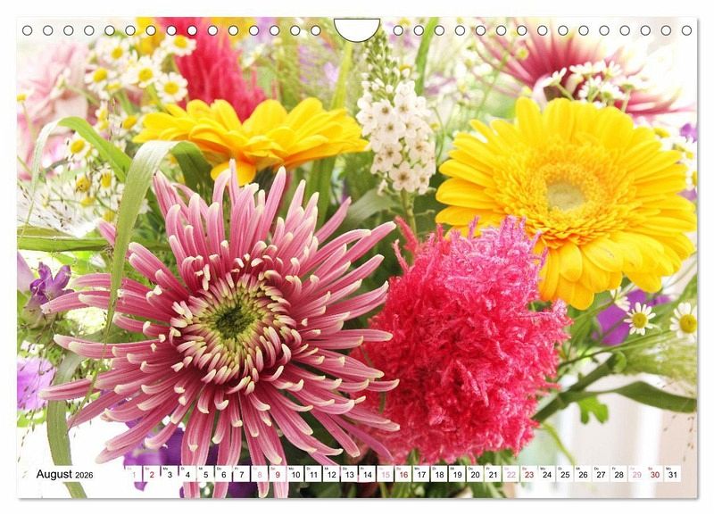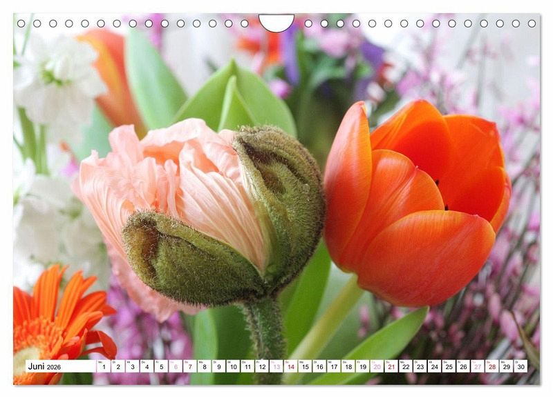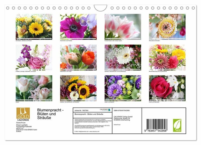 Ein Leben ohne Blumen? Undenkbar! Die Blüten und Sträuße in diesem gelungenen Kalender sind kleine Seelenschmeichler und bereichern nicht nur Ihre Wände. Genießen Sie Frühlingsblumen wie Tulpen, Anemonen und Ranunkel sowie sommerliche Mohnblumen, Gerbera, Rosen, Sonnenblumen und Dahlien, um nur einige aus dem bunten Blütenreigen zu nennen. Dieser qualitativ hochwertige