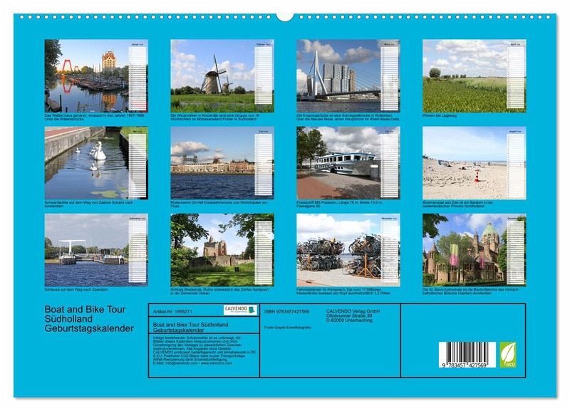 Der Kalender Boat und Bike Tour startend in Amsterdam und zeigt die schöne Landschaft, Natur und Architektur von Holland. Vom Strand Bloemendaal am See, Naturschutzgebiet Dünen, Mühlen und was Holland sehenswert macht. Das Weiße Haus, die Schleuse Zaandam, die Brücke im Rhein-Maas-Delta Rotterdam und glanzvolle niederländische Architektur.