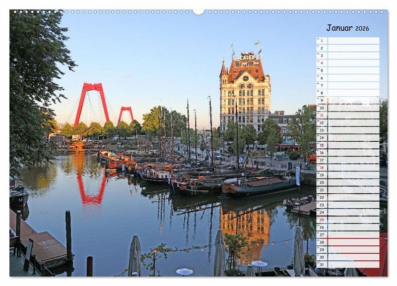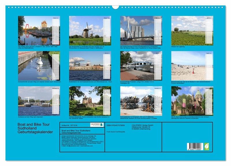 Der Kalender Boat und Bike Tour startend in Amsterdam und zeigt die schöne Landschaft, Natur und Architektur von Holland. Vom Strand Bloemendaal am See, Naturschutzgebiet Dünen, Mühlen und was Holland sehenswert macht. Das Weiße Haus, die Schleuse Zaandam, die Brücke im Rhein-Maas-Delta Rotterdam und glanzvolle niederländische Architektur. Entstanden ist der Kalender durch die Boat und Bike Tour wo zahlreiche schöne Fotos entstanden sind.