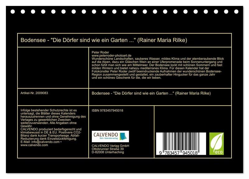 Wunderschöne Landschaften, sauberes Wasser, mildes Klima und der atemberaubende Blick auf die Alpen, dazu ein Gläschen Wein an einer Uferpromenade beim Sonnenuntergang und schon fühlt man sich wie am Mittelmeer. Der Bodensee lockt mit schönen Sommern und fast milden Wintern und bietet nahezu mediterranes Klima. Für diesen Kalender hat der Fotokünstler Peter Roder zwölf beeindruckende Aufnahmen der wunderschönen Bodensee-Region zusammengestellt und gestaltet, ein zauberhafter Hingucker für das ganze Jahr und ein schönes Geschenk für die, die wir lieben.