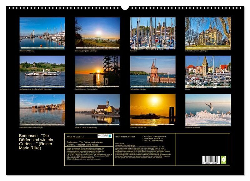 Wunderschöne Landschaften, sauberes Wasser, mildes Klima und der atemberaubende Blick auf die Alpen, dazu ein Gläschen Wein an einer Uferpromenade beim Sonnenuntergang und schon fühlt man sich wie am Mittelmeer. Der Bodensee lockt mit schönen Sommern und fast milden Wintern und bietet nahezu mediterranes Klima. Für diesen Kalender hat der Fotokünstler Peter Roder zwölf beeindruckende Aufnahmen der wunderschönen Bodensee-Region zusammengestellt und gestaltet, ein zauberhafter Hingucker für das ganze Jahr und ein schönes Geschenk für die, die wir lieben.