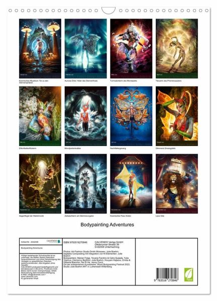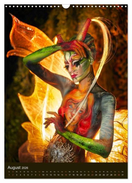 Entdecken Sie die Grenzen der Vorstellungskraft mit dem neuesten Bodypainting-Kalender von Julie Boehm. Meisterhaft gefertigte Körperkunstwerke von weltbekannten Bodypaintern vereinen sich mit Julies phantastischer Bildbearbeitung, um uns auf eine Reise durch neu erschaffene Welten zu entführen. Eigene, faszinierende Geschichten, direkt auf die Haut gemalt. Lassen Sie sich Monat für Monat in eine Welt entführen, in der die Linien zwischen Realität und Fantasie verschwimmen und neue Horizonte des Möglichen entstehen.