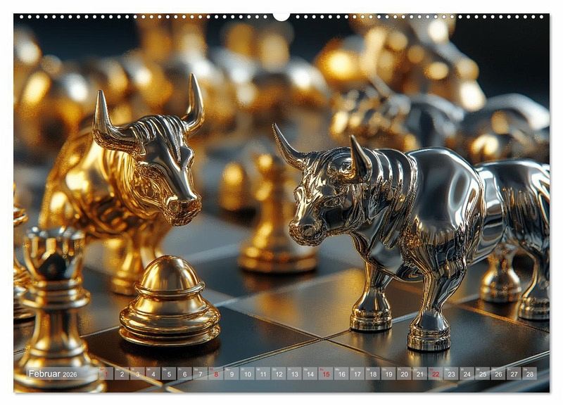 Februar: Der Kampf der Bullen. Bullenfiguren auf einem Schachbrett und symbolisiert die Intensität und den Wettbewerb.