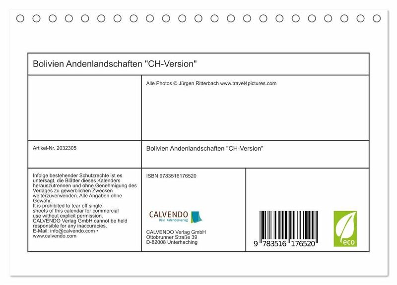 QUALITÄT - Hochwertiger Fotokalender mit 12 wunderschönen Motiven auf lichtbeständigem Bilderdruckpapier, robuste Spiralbindung.NACHHALTIG - deutliche Abfallreduzierung durch bedarfsgerechte Einzelstückfertigung, umweltfreundliches FSC-zertifiziertes Papier, Produktion in Deutschland, klimabewusste Logistik.PERFEKTES GESCHENK - Kalender für Freunde und Familie, für Kinder und Erwachsene, jung und alt, zu Weihnachten, Geburtstag oder zwischendurch.VIELFALT - Bildkalender in verschiedenen Formaten, z.B. DIN A5, DIN A4, DIN A3 sowie DIN A2. Ob Naturmotiv, Gemälde oder Fotos, ideal für ein persönliches Wohlfühlambiente.Fotos faszinierender Andenlandschaften im südamerikanischen Bolivien von Autor(in): www.travel4pictures.com