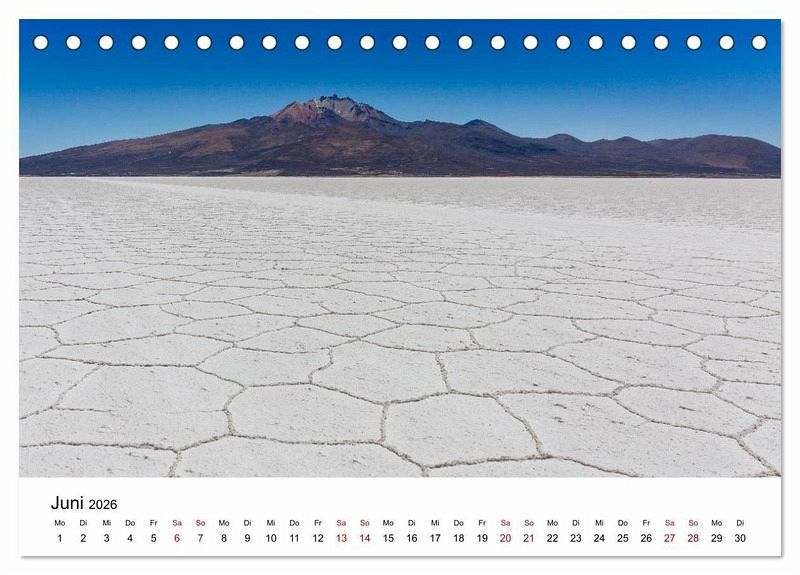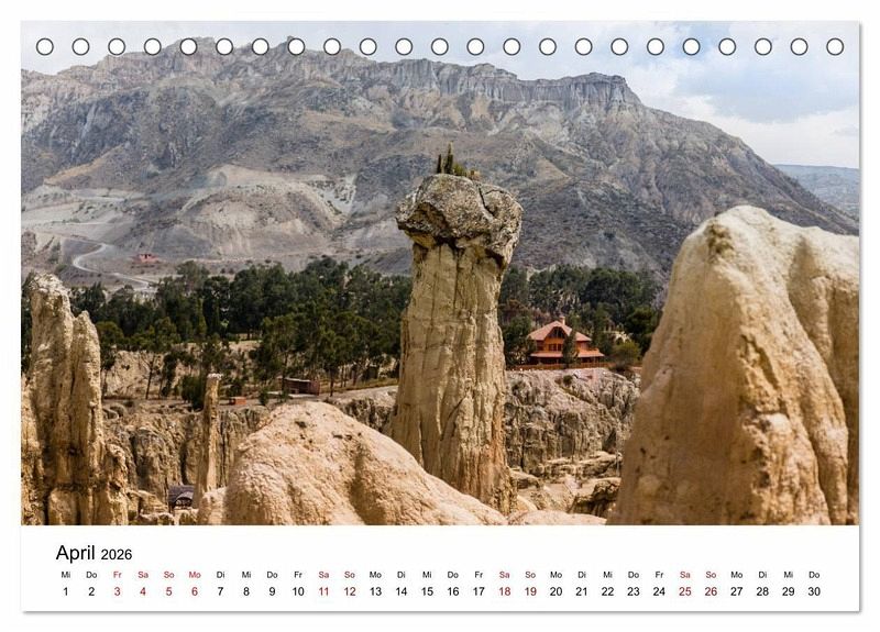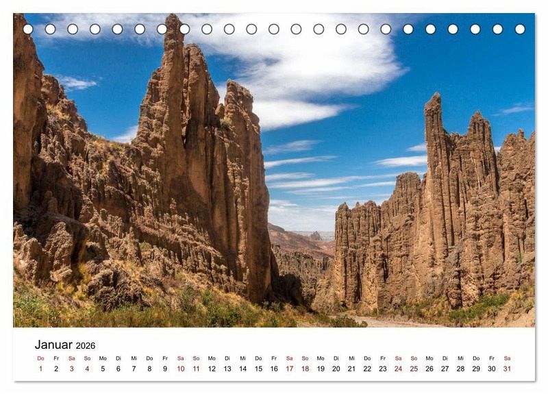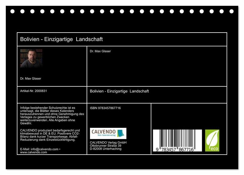 Bolivien hat eine Vielfalt an geographischen Zonen. Im Osten befinden sich die Anden mit Bergen über 6.000 m ü.M. Lagunen mit wunderschönen Farben, Salzseen und surrealistischen Wüsten. Im Westen befindet sich das Tiefland mit tropischem Klima, das feuchte Regenwälder ermöglicht. Hier findet man grüne Landschaften und schöne Wasserfälle. Der Photograph Max Glaser, präsentiert in diesem Kalender einzigartige Fotografien der wunderschönen Landschaft Boliviens.