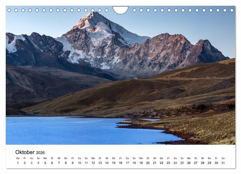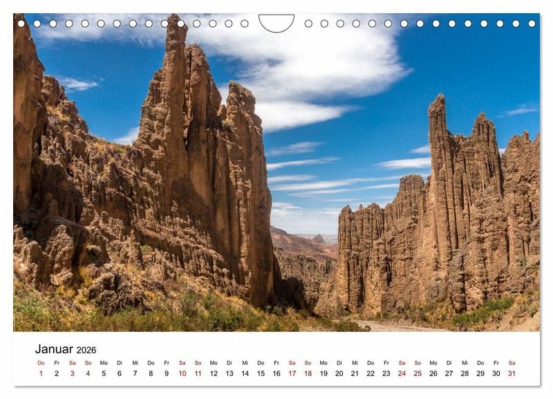 Bolivien hat eine Vielfalt an geographischen Zonen. Im Osten befinden sich die Anden mit Bergen über 6.000 m ü.M. Lagunen mit wunderschönen Farben, Salzseen und surrealistischen Wüsten. Im Westen befindet sich das Tiefland mit tropischem Klima, das feuchte Regenwälder ermöglicht. Hier findet man grüne Landschaften und schöne Wasserfälle. Der Photograph Max Glaser, präsentiert in diesem Kalender einzigartige Fotografien der wunderschönen Landschaft Boliviens.