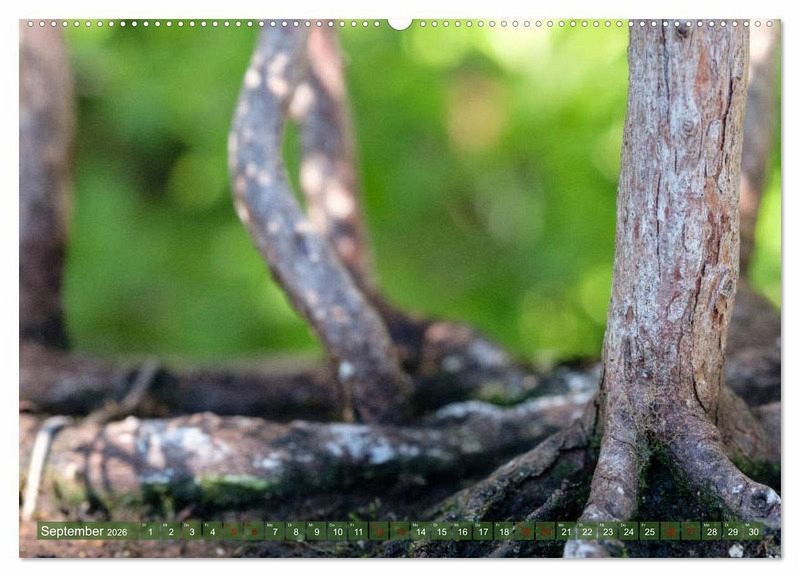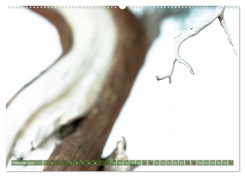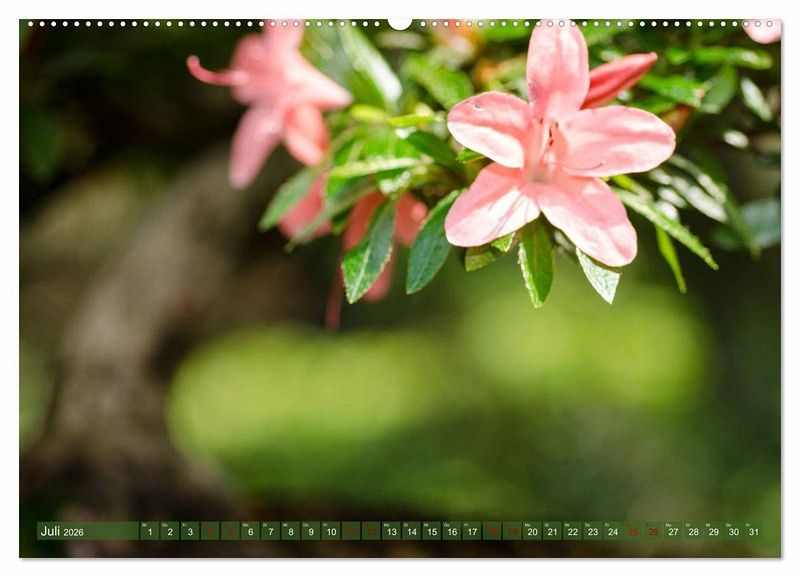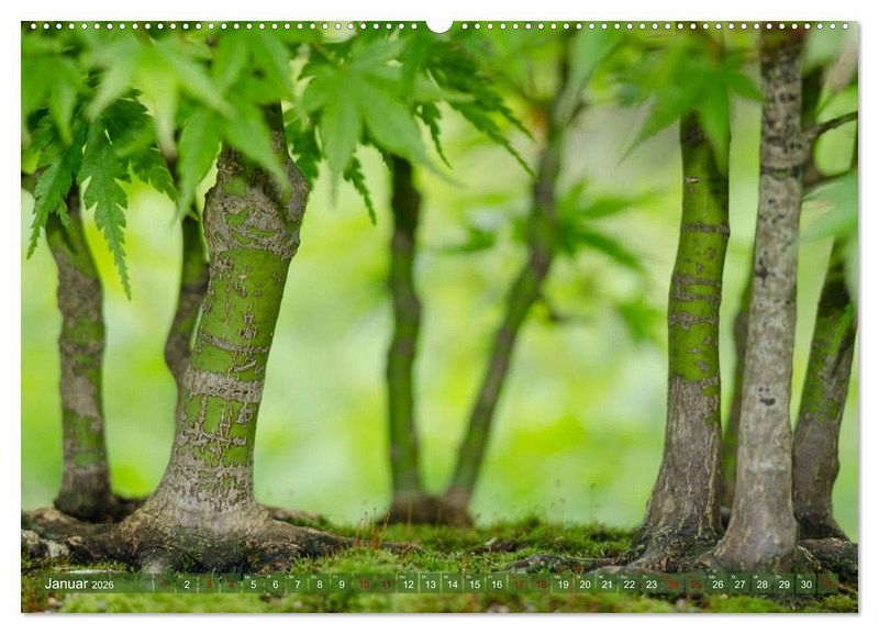 Ein Monatskalender mit Fotografien von Bonsai Bäumen aus der Nähe betrachtet und fotografiert.