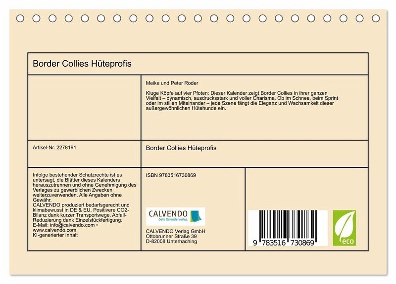Eleganz in Bewegung, Intelligenz im Blick. Dieser Kalender zeigt Border Collies in ihrer ganzen Vielfalt - athletisch, aufmerksam und voller Ausdruckskraft. Ob im Tiefschnee, im Galopp oder im vertrauten "Gespräch" unter Artgenossen - jede Szene feiert die Schönheit und Dynamik dieser faszinierenden Hütehunde. Mit fließenden Bewegungen, wohlproportionierten Körpern und einem wachen Geist verkörpern sie die perfekte Balance aus Kraft und Kontrolle. Gestaltet mit dem Auge fürs Detail zeigen diese Bilder das Wesen dieser intelligenten und anspruchsvollen Hunde, wobei die grafische Umsetzung im Zusammenspiel klassischer Gestaltung und ausgewählter KI-basierter Methoden erfolgte. Perfekt für alle Border Collie- und Hunde-Fans.