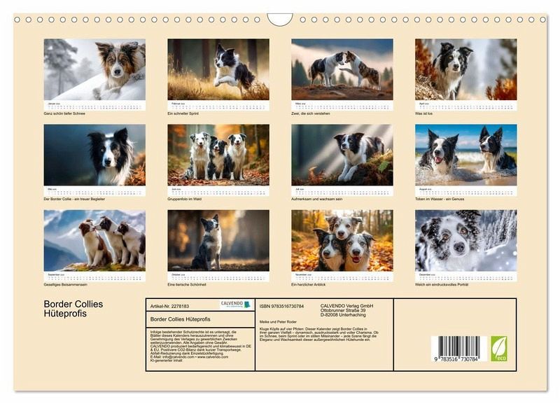 Eleganz in Bewegung, Intelligenz im Blick. Dieser Kalender zeigt Border Collies in ihrer ganzen Vielfalt - athletisch, aufmerksam und voller Ausdruckskraft. Ob im Tiefschnee, im Galopp oder im vertrauten "Gespräch" unter Artgenossen - jede Szene feiert die Schönheit und Dynamik dieser faszinierenden Hütehunde. Mit fließenden Bewegungen, wohlproportionierten Körpern und einem wachen Geist verkörpern sie die perfekte Balance aus Kraft und Kontrolle. Gestaltet mit dem Auge fürs Detail zeigen diese Bilder das Wesen dieser intelligenten und anspruchsvollen Hunde, wobei die grafische Umsetzung im Zusammenspiel klassischer Gestaltung und ausgewählter KI-basierter Methoden erfolgte. Perfekt für alle Border Collie- und Hunde-Fans.