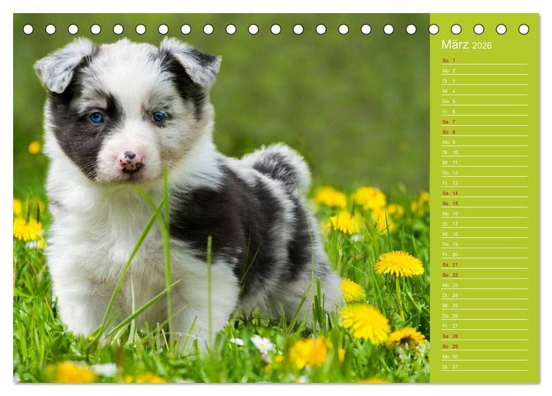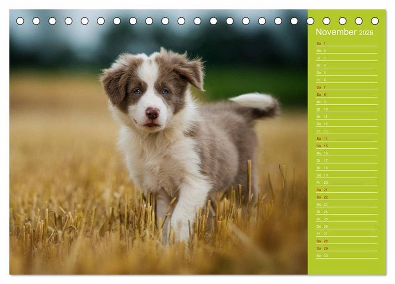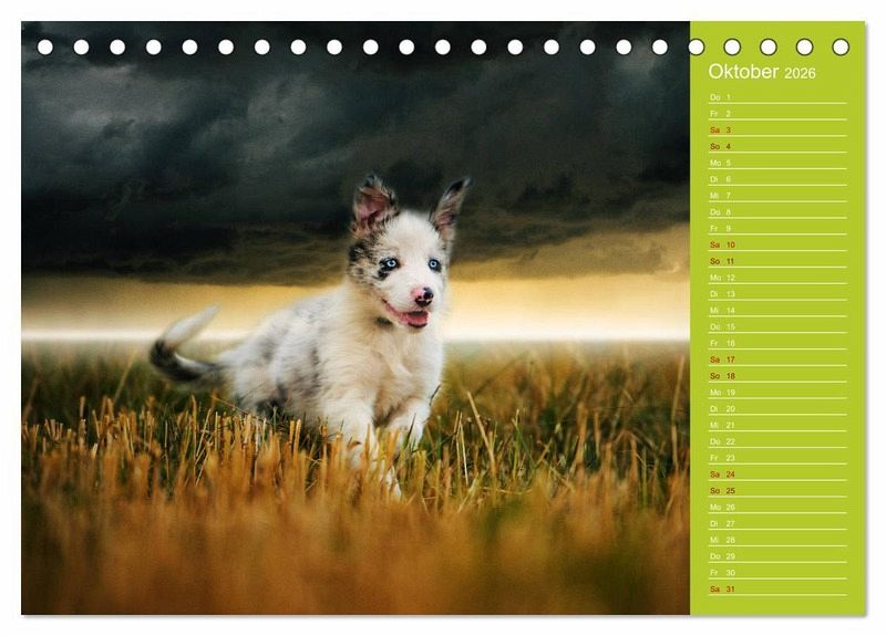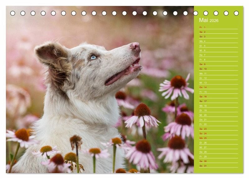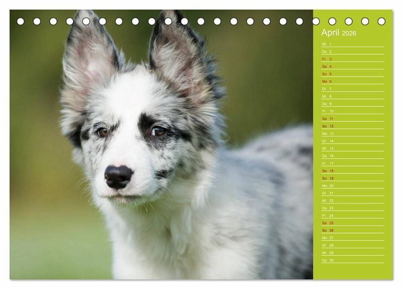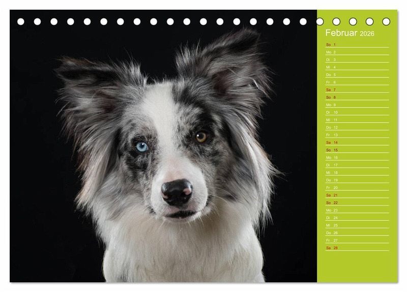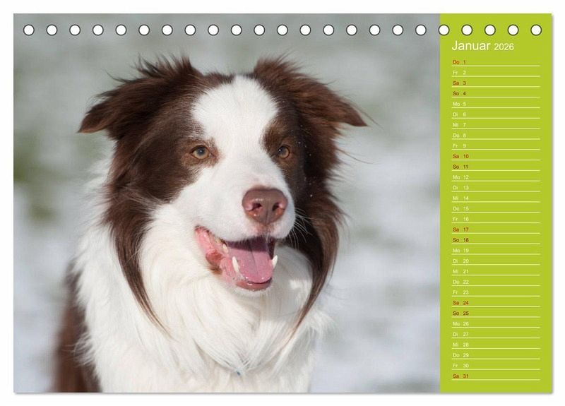 Border Collies, bei vielen immer noch im typischen schwarzweiß bekannt, gibt es in einer breiten Farbpalette. Ein paar dieser wunderbaren Farben gibt es in diesem Kalender zu sehen.