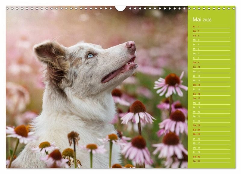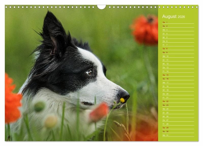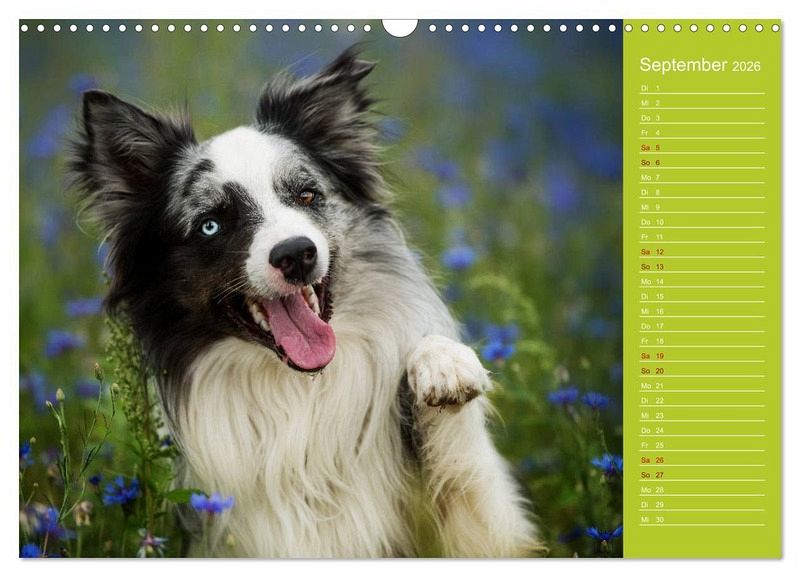 Border Collies, bei vielen immer noch im typischen schwarzweiß bekannt, gibt es in einer breiten Farbpalette. Ein paar dieser wunderbaren Farben gibt es in diesem Kalender zu sehen.