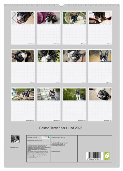 PREMIUM-LINIE - Brillanter Fotokalender mit 12 wunderschönen Motiven, Kunstdruck in Hochglanz in Museumsqualität.QUALITÄT - edle Materialien, stabile Rückwand mit 2 innovativen Einstecktaschen für eine optimale Präsentation an der Wand.NACHHALTIG - deutliche Abfallreduzierung durch bedarfsgerechte Einzelstückfertigung, umweltfreundliches FSC-zertifiziertes Papier, Produktion in Deutschland, klimabewusste Logistik.PERFEKTES GESCHENK - Kalender für Freunde und Familie, für Kinder und Erwachsene, jung und alt, zu Weihnachten, Geburtstag oder zwischendurch.Ein schöner Kalender für Hundefreude und Liebhaber von Boston Terrier von Autor(in): Nailia