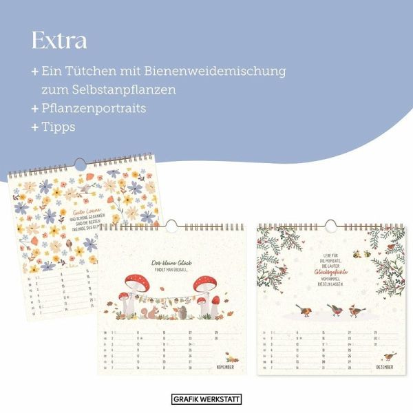 Der "blühende Kalender" bereitet nicht nur lieben Menschen viel Freude, sondern auch Bienen und anderen Insekten: In diesem Kalender steckt ein Saatgut-Tütchen mit einer bunten Bienenweidemischung!Solch ein tolles Tütchen liegt auch unseren "Botanic Cards" bei, die neue insektenfreundliche Grußkartenserie mit 35 floralen Designs.