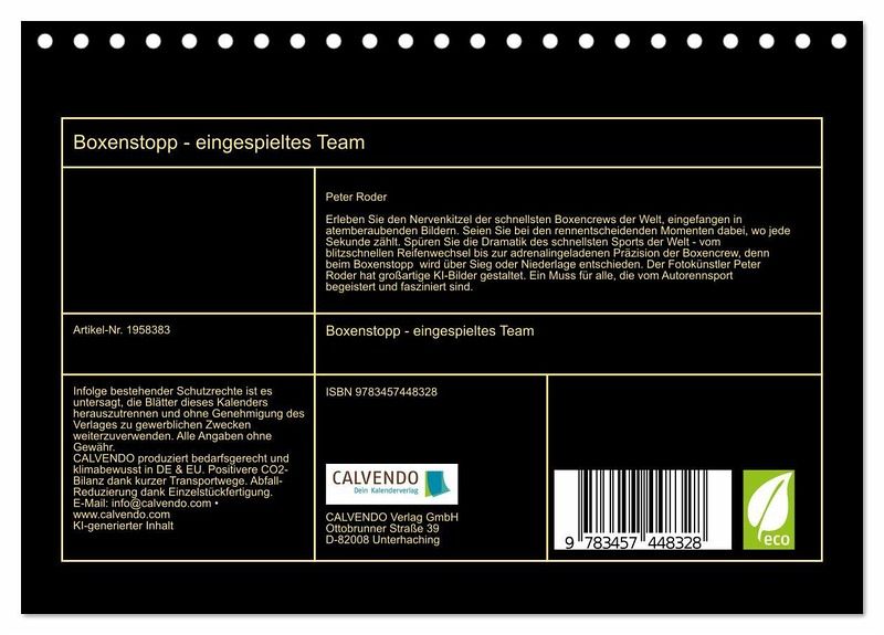 Erleben Sie den Nervenkitzel der schnellsten Boxencrews der Welt, eingefangen in atemberaubenden Bildern. Seien Sie bei den rennentscheidenden Momenten dabei, wo jede Sekunde zählt. Spüren Sie die Dramatik des schnellsten Sports der Welt - vom blitzschnellen Reifenwechsel bis zur adrenalingeladenen Präzision der Boxencrew, denn beim Boxenstopp wird über Sieg oder Niederlage entschieden. Der Fotokünstler Peter Roder hat großartige KI-Bilder gestaltet. Ein Muss für alle, die vom Autorennsport begeistert und fasziniert sind.