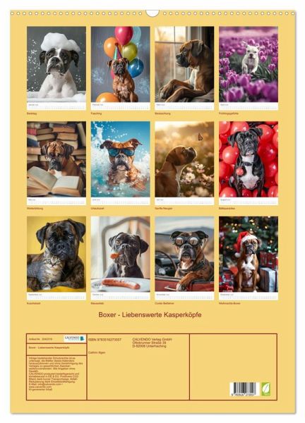 Ihr Kalender mit KI generierten Bilder einer der lustigsten und liebenswertesten Hunderasse: der Boxer. Die trolligen Samtschnuten verzaubern und begeistern immer wieder aufs Neue, bringen uns zum Lachen und erfüllen unser Herz mit Wärme, Zuneigung und Loyalität.