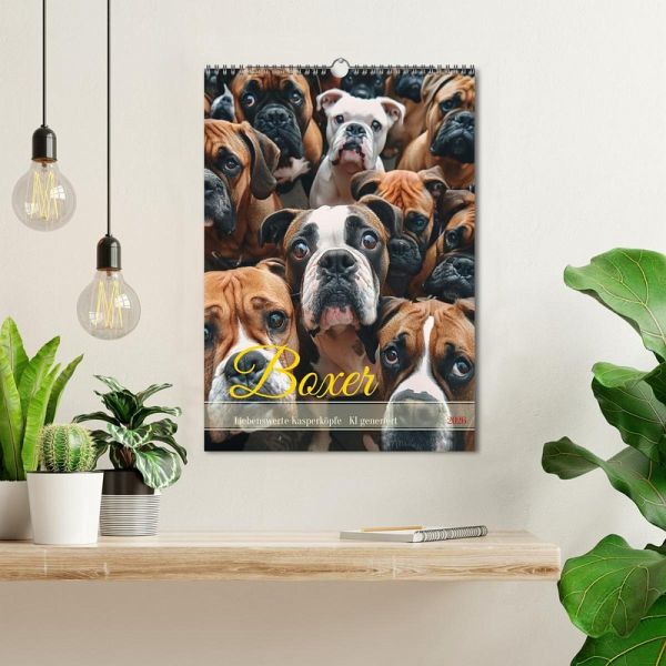 Ihr Kalender mit KI generierten Bilder einer der lustigsten und liebenswertesten Hunderasse: der Boxer. Die trolligen Samtschnuten verzaubern und begeistern immer wieder aufs Neue, bringen uns zum Lachen und erfüllen unser Herz mit Wärme, Zuneigung und Loyalität.