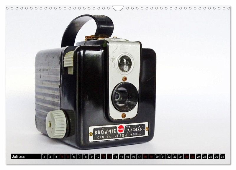 Juli: Die Kodak Brownie Fiesta ist ebenfalls technisch einfach, besteht aber auch schon aus dem Kunststoff Bakelit.