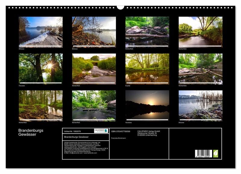 Dieser Kalender beinhaltet eine Sammlung von ausgewählten Wasserlandschaften in Brandenburg. Es werden Seen und Flüsse in Brandenburg gezeigt, die allesamt ein schönes Ambiente bieten. Alle Orte sind dabei namentlich genannt.