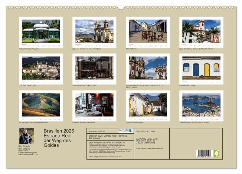 QUALITÄT - Hochwertiger Fotokalender mit 12 wunderschönen Motiven auf lichtbeständigem Bilderdruckpapier, robuste Spiralbindung mit Aufhängebügel.NACHHALTIG - deutliche Abfallreduzierung durch bedarfsgerechte Einzelstückfertigung, umweltfreundliches FSC-zertifiziertes Papier, Produktion in Deutschland, klimabewusste Logistik.PERFEKTES GESCHENK - Kalender für Freunde und Familie, für Kinder und Erwachsene, jung und alt, zu Weihnachten, Geburtstag oder zwischendurch.VIELFALT - Bildkalender in verschiedenen Formaten, z.B. DIN A5, DIN A4, DIN A3 sowie DIN A2. Ob Naturmotiv, Gemälde oder Fotos, ideal für ein persönliches Wohlfühlambiente.Auf den Spuren des Goldes - die Estrada Real verbindet die prächtigen Barockstädte in Minas Gerais mit der Küste. von Autor(in): Uwe Bergwitz