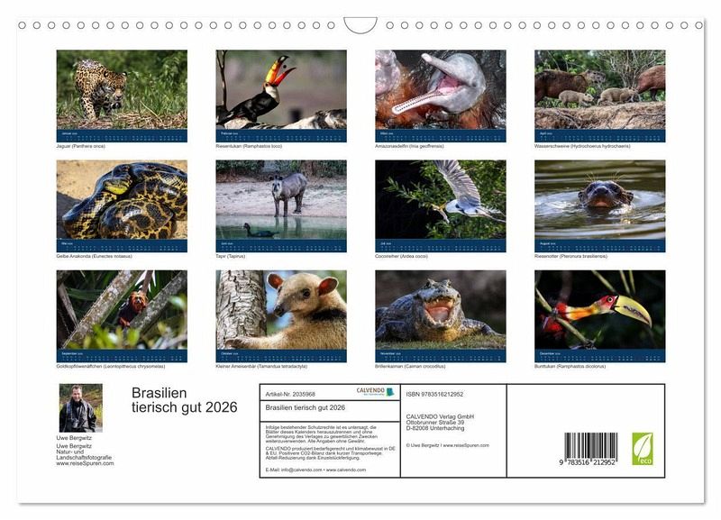 QUALITÄT - Hochwertiger Fotokalender mit 12 wunderschönen Motiven auf lichtbeständigem Bilderdruckpapier, robuste Spiralbindung mit Aufhängebügel.NACHHALTIG - deutliche Abfallreduzierung durch bedarfsgerechte Einzelstückfertigung, umweltfreundliches FSC-zertifiziertes Papier, Produktion in Deutschland, klimabewusste Logistik.PERFEKTES GESCHENK - Kalender für Freunde und Familie, für Kinder und Erwachsene, jung und alt, zu Weihnachten, Geburtstag oder zwischendurch.VIELFALT - Bildkalender in verschiedenen Formaten, z.B. DIN A5, DIN A4, DIN A3 sowie DIN A2. Ob Naturmotiv, Gemälde oder Fotos, ideal für ein persönliches Wohlfühlambiente.Tierparadies Brasilien - in freier Wildbahn auf der Spur von Tapir, Jaguar, Anakonda und Co. von Autor(in): Uwe Bergwitz