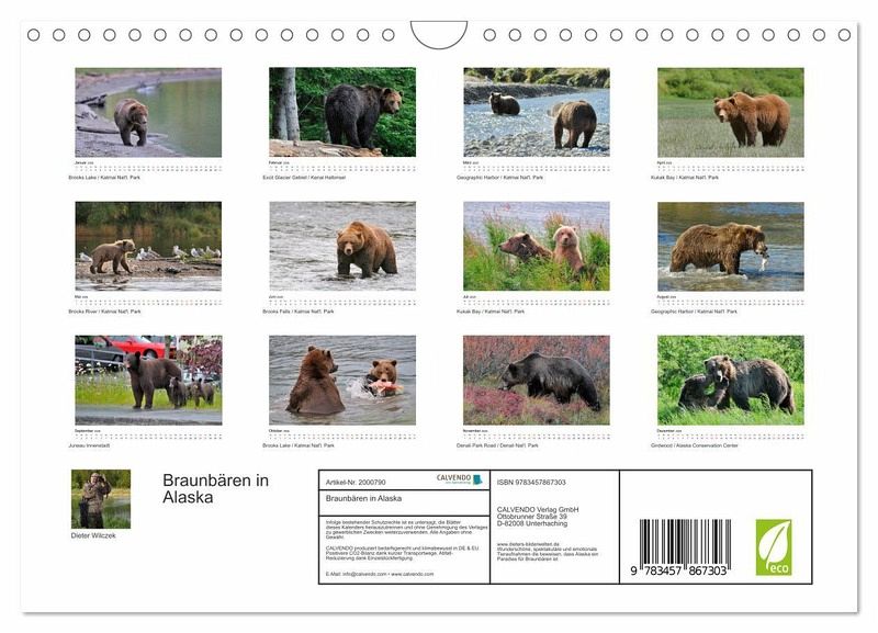 Dieter Wilczek - Erlebnisfotograf und naturverbunden - konnte bei seinen vielen Besuchen in Alaska immer wieder Braunbären beobachten und in ihrer natürlichen Umgebung wie Wälder, Seeufer und Flussläufe fotografieren. Seine ausdruckstärksten Fotos hat er in diesem Kalender zusammengefasst.