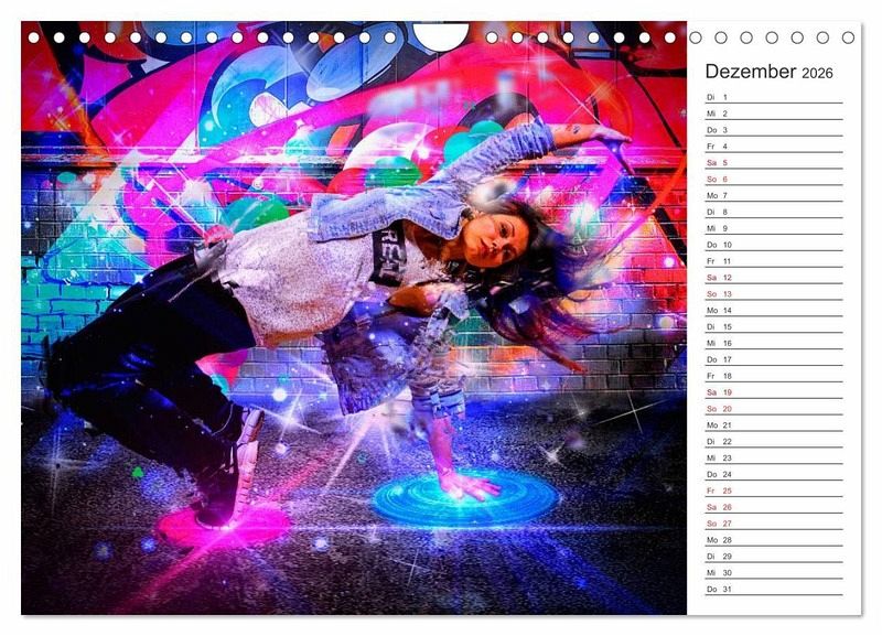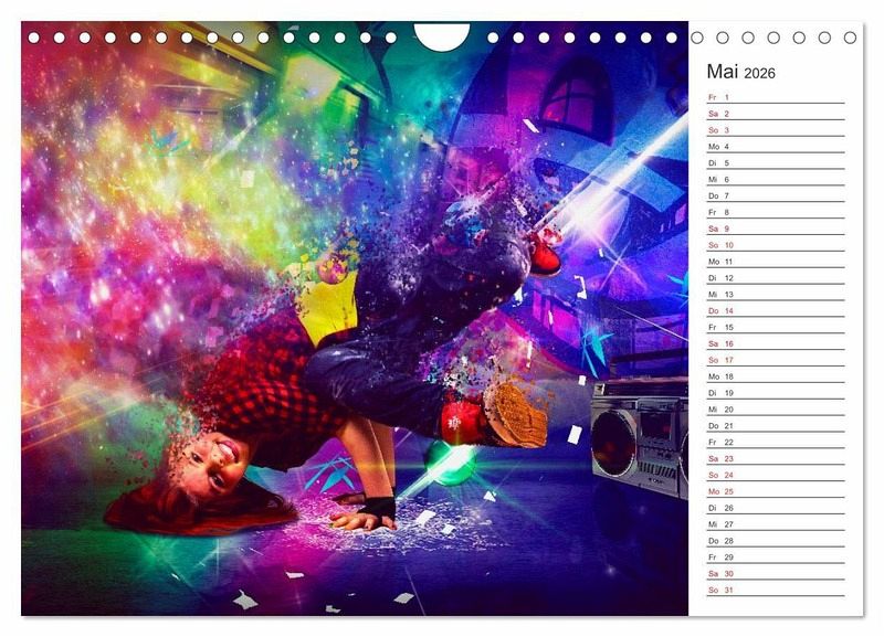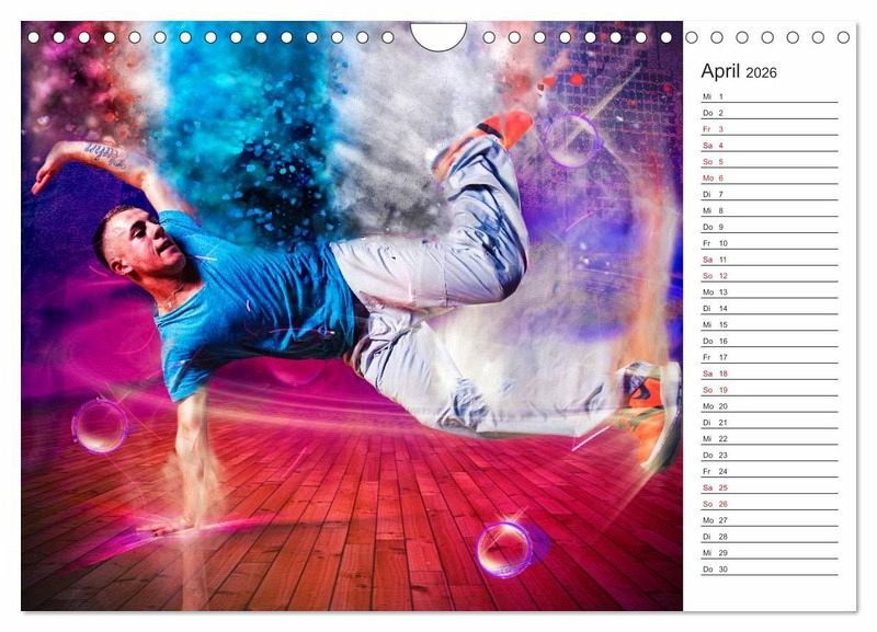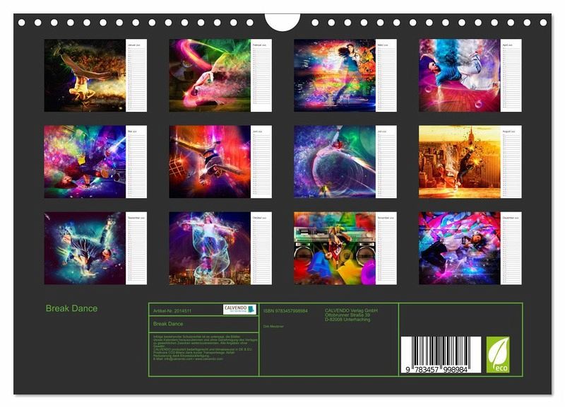 Break Dance ist eine ursprünglich auf der Straße getanzte Tanzform, erfunden von afroamerikanischen Jugendlichen in Manhattan und der südlichen Bronx im New York der frühen 1970er Jahre. Getanzt wird zu Pop, Funk oder Hip-Hop. Der Fotograf & DigitalArt Künstler Dirk Meutzner hat sich diesem Thema angenommen und die Tänzerinnen und Tänzer in phantastisch abstrakte Welten projiziert. Herausgekommen ist dieser einmalig wundervolle Kalender mit Planerfunktion.