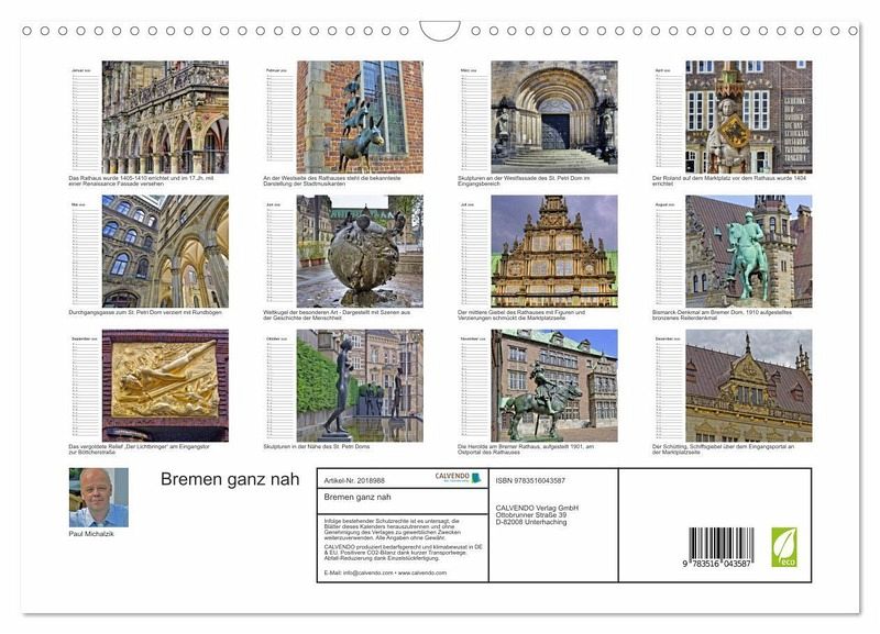 QUALITÄT - Hochwertiger Fotokalender mit 12 wunderschönen Motiven auf lichtbeständigem Bilderdruckpapier, robuste Spiralbindung mit Aufhängebügel.NACHHALTIG - deutliche Abfallreduzierung durch bedarfsgerechte Einzelstückfertigung, umweltfreundliches FSC-zertifiziertes Papier, Produktion in Deutschland, klimabewusste Logistik.PERFEKTES GESCHENK - Kalender für Freunde und Familie, für Kinder und Erwachsene, jung und alt, zu Weihnachten, Geburtstag oder zwischendurch.VIELFALT - Bildkalender in verschiedenen Formaten, z.B. DIN A5, DIN A4, DIN A3 sowie DIN A2. Ob Naturmotiv, Gemälde oder Fotos, ideal für ein persönliches Wohlfühlambiente.Erleben sie Sehenswürdigkeiten in Bremen ganz nah von Autor(in): Paul Michalzik
