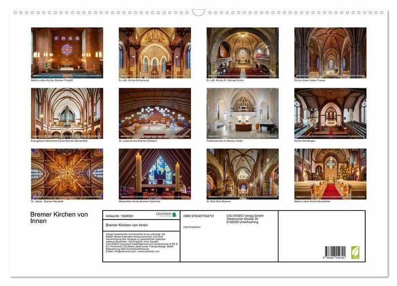 Dieser qualitativ hochwertige Kalender gehört zur exklusiven CALVENDO Gold-Edition und wurde zusätzlich in der Klasse "Architektur" ausgezeichnet. Entdecken Sie die faszinierende Schönheit unserer Bremer Kirchen von Innen! Tauchen Sie ein in die Welt der spirituellen Architektur und erleben Sie die harmonische Verbindung von Geschichte, Glauben und Kunst. Jeden Monat entführt Sie dieser atemberaubende Kalender in eine andere evangelische Kirche in Bremen. Erleben Sie die kunstvollen Deckenmalereien, beeindruckenden Orgeln, schillernden Glasfenster und die prachtvolle Ausstattung, die diese…mehr