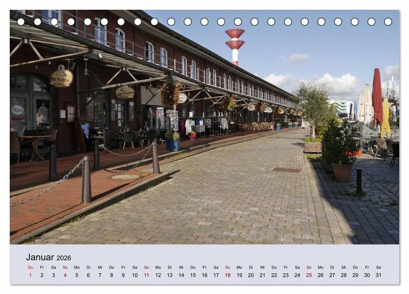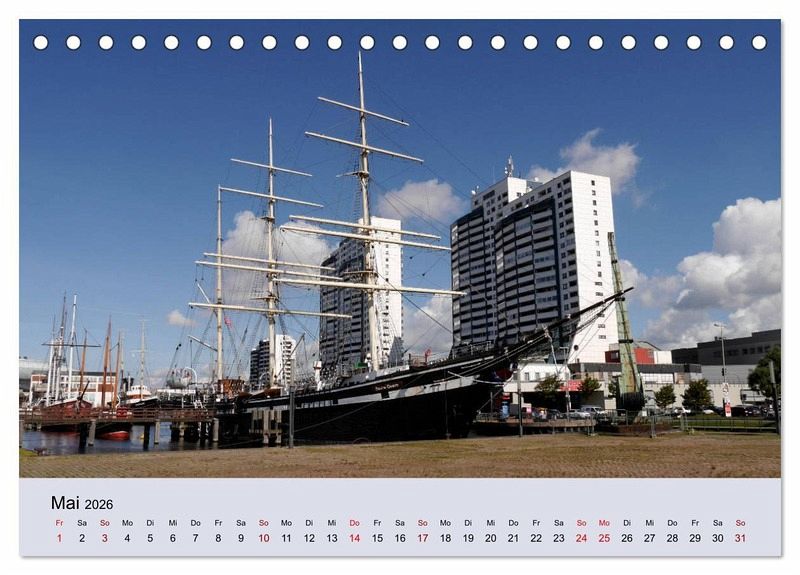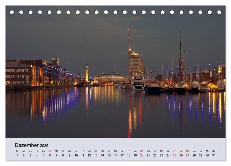 Der Kalender zeigt Ihnen die Sehenswürdigkeiten Bremerhavens! Am Ortseingang der Fischereihafen mit seinem Schaufenster (Restaurants, Kneipen, Geschäfte mit maritimem Zubehör). Weiter nach Geestemünde zum Holzhafen und zur Geestemündung. Dann die Stadtmitte mit Segelschiffen, Leuchttürmen, Klimahaus, Mediterraneo sowie dem Atlantic Hotel City (Dubai Turm). Auch nicht zu vernachlässigen der schöne Gesundheitspark Speckenbüttel mit seiner Bockwindmühle.