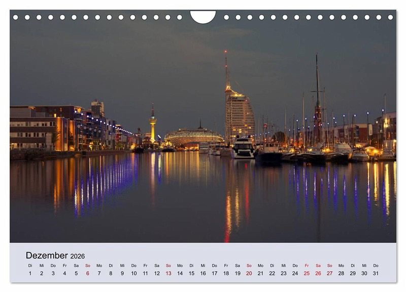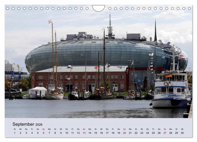Der Kalender zeigt Ihnen die Sehenswürdigkeiten Bremerhavens! Am Ortseingang der Fischereihafen mit seinem Schaufenster (Restaurants, Kneipen, Geschäfte mit maritimem Zubehör). Weiter nach Geestemünde zum Holzhafen und zur Geestemündung. Dann die Stadtmitte mit Segelschiffen, Leuchttürmen, Klimahaus, Mediterraneo sowie dem Atlantic Hotel City (Dubai Turm). Auch nicht zu vernachlässigen der schöne Gesundheitspark Speckenbüttel mit seiner Bockwindmühle.