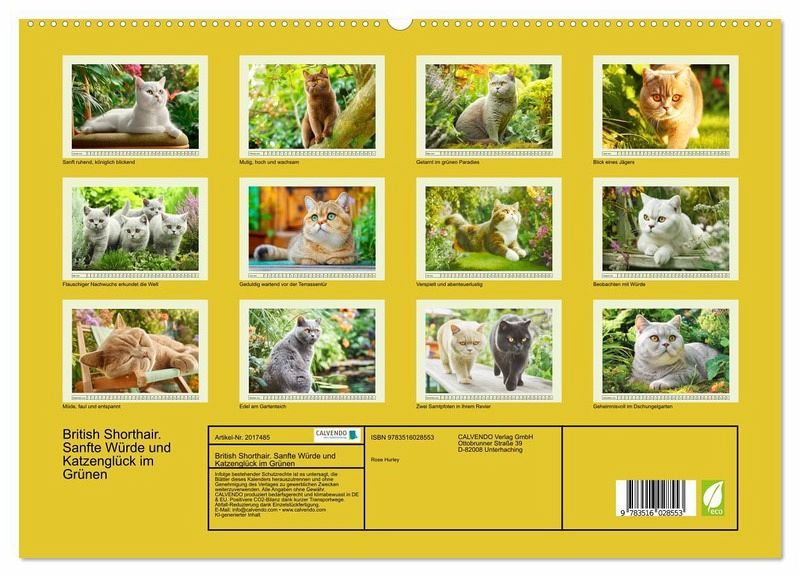 PREMIUM-LINIE - Brillanter Fotokalender mit 12 wunderschönen Motiven, Kunstdruck in Hochglanz in Museumsqualität.QUALITÄT - edle Materialien, stabile Rückwand mit 2 innovativen Einstecktaschen für eine optimale Präsentation an der Wand.NACHHALTIG - deutliche Abfallreduzierung durch bedarfsgerechte Einzelstückfertigung, umweltfreundliches FSC-zertifiziertes Papier, Produktion in Deutschland, klimabewusste Logistik.PERFEKTES GESCHENK - Kalender für Freunde und Familie, für Kinder und Erwachsene, jung und alt, zu Weihnachten, Geburtstag oder zwischendurch.Die Sanfte Eleganz der British Shorthair in schönen Gartenszenen von Autor(in): Rose Hurley