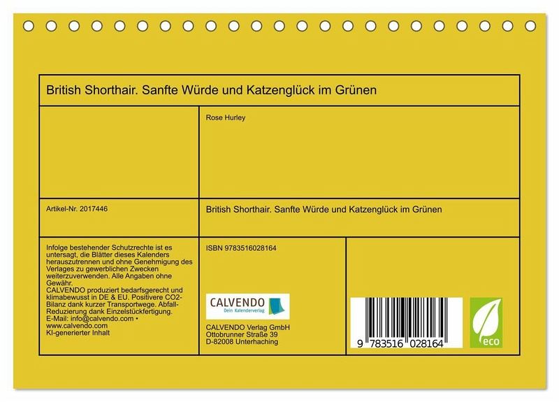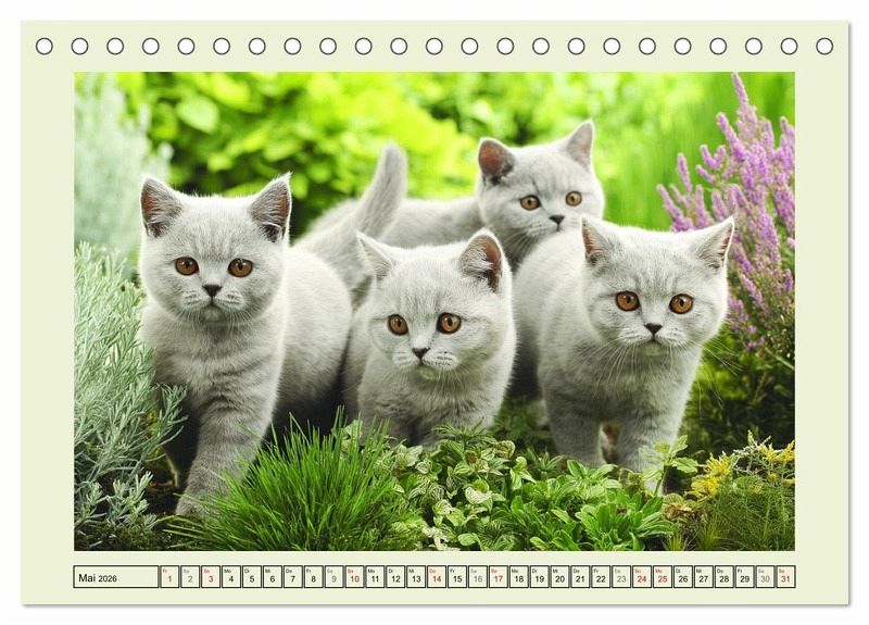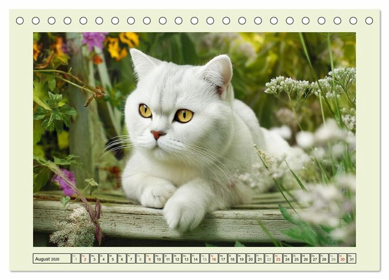 Dieser Kalender widmet sich der unverwechselbaren Ausstrahlung der British Shorthair - mit ihren runden Gesichtern, ausdrucksstarken Augen und plüschigem Fell. Alle Bilder wurden mit der Hilfe von KI erstellt und zeigen die Katzen in liebevoll gestalteten Gartenszenen. Ob neugierig, gelassen oder verspielt, jede Szene fängt die besondere Persönlichkeit dieser Rasse auf eindrucksvolle Weise ein. Ein stilvoller Begleiter durchs Jahr für alle Katzenfreunde und Liebhaber britischer Samtpfoten.