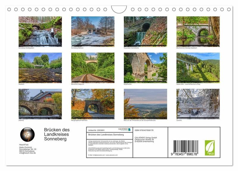 QUALITÄT - Hochwertiger Fotokalender mit 12 wunderschönen Motiven auf lichtbeständigem Bilderdruckpapier, robuste Spiralbindung mit Aufhängebügel.NACHHALTIG - deutliche Abfallreduzierung durch bedarfsgerechte Einzelstückfertigung, umweltfreundliches FSC-zertifiziertes Papier, Produktion in Deutschland, klimabewusste Logistik.PERFEKTES GESCHENK - Kalender für Freunde und Familie, für Kinder und Erwachsene, jung und alt, zu Weihnachten, Geburtstag oder zwischendurch.VIELFALT - Bildkalender in verschiedenen Formaten,z.B. DIN A5, DIN A4, DIN A3 sowie DIN A2. Ob Naturmotiv, Gemälde oder Fotos, ideal für ein persönliches Wohlfühlambiente.13 brillante Bilder zeigen eine faszinierende Brücken des Landkreises Sonneberg von Autor(in): HeschFoto