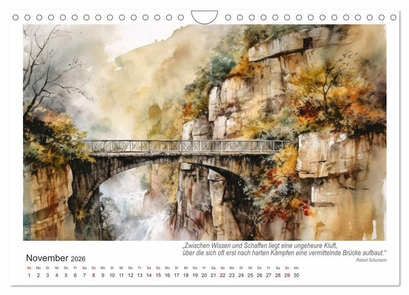 Brücken verbinden, Brücken überwinden Abgründe, ob aus Holz, Stahl oder Stein. Brücken sind faszinierende Bauwerke. Die Autorin hat mit Hilfe von KI romantische Brückenaquarelle geschaffen und mit passenden Zitaten berühmter Menschen versehen, die sich Gedanken über Brücken gemacht haben.