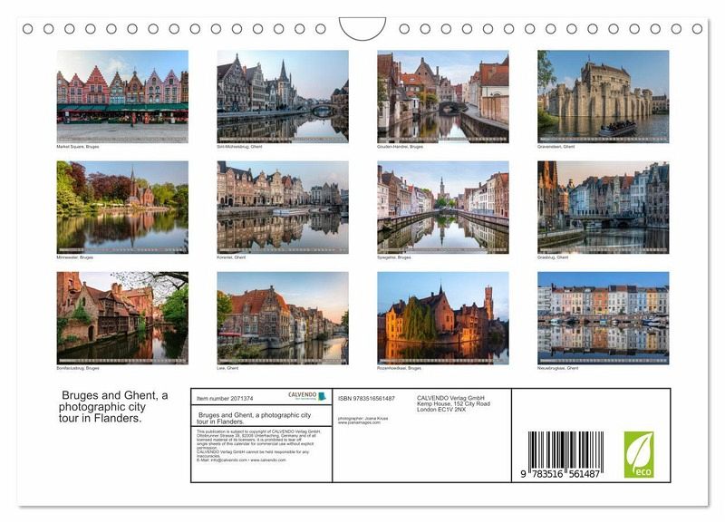 QUALITY - High-quality photo calendar with 12 beautiful images on light-resistant paper, robust spiral binding with hanger.SUSTAINABLE - Significant waste reduction due to print-on-demand production, environmentally friendly FSC-certified paper, produced in the UK, climate-conscious logistical processes.PERFECT GIFT - calendars for friends and family, for children, all ages and all occasions, from Christmas to birthdays and everything in between.LOTS OF CHOICE - Wall calendars in different sizes (DIN A4 and DIN A3), for any topic and personal taste, featuring photography, painting and illustrations.This photo calendar shows the medieval majesty and rich historical heritage of Ghent and Bruges, author: Joana Kruse