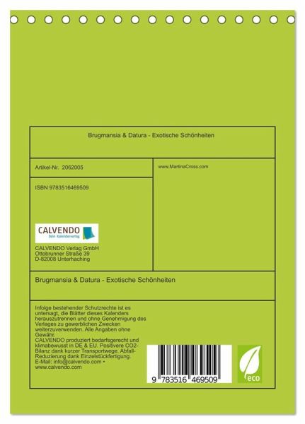 QUALITÄT - Hochwertiger Fotokalender mit 12 wunderschönen Motiven auf lichtbeständigem Bilderdruckpapier, robuste Spiralbindung.NACHHALTIG - deutliche Abfallreduzierung durch bedarfsgerechte Einzelstückfertigung, umweltfreundliches FSC-zertifiziertes Papier, Produktion in Deutschland, klimabewusste Logistik.PERFEKTES GESCHENK - Kalender für Freunde und Familie, für Kinder und Erwachsene, jung und alt, zu Weihnachten, Geburtstag oder zwischendurch.VIELFALT - Bildkalender in verschiedenen Formaten, z.B. DIN A5, DIN A4, DIN A3 sowie DIN A2. Ob Naturmotiv, Gemälde oder Fotos, ideal für ein persönliches Wohlfühlambiente.Brugmansia & Datura - Exotische Kübelpflanzen Schönheiten im Protrait von Autor(in): Martina Cross
