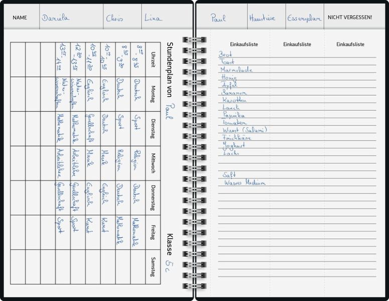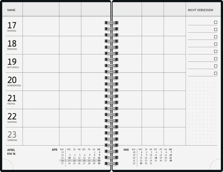 Blattgröße: 148 × 210 mm 2 Seiten = 1 Woche 192 Seiten, Druckfarbe Kalendarium: grau 90 g/m², Wire-O-Bindung Grafik-Einband, Farbe: bunt Jahresübersicht Vorjahr, aktuelles Jahr und Folgejahr, 8 Seiten Monatsplan aktuelles Jahr und Folgejahr, Ferientermine Deutschland und Österreich, 6 Seiten Stundenpläne Gummizugverschluss perforierte Einkaufslisten, mit Stiftschlaufe und Sammeltasche Eckperforation für Kalenderjahr 2026